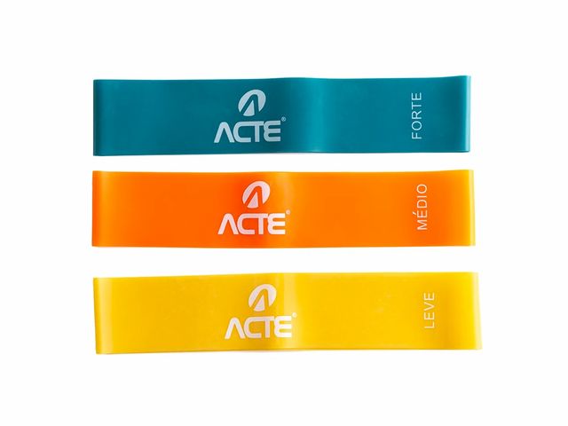 O Kit Mini Band Acte são faixas elásticas produzidas em látex natural de alta resistência, seu uso viabiliza aumentar a efetividade dos exercícios em diferentes níveis de treinos. Possuem tamanho menor que outras faixas elásticas padrões, e estão disponíveis em três cores, nas intensidades: leve, médio e forte.